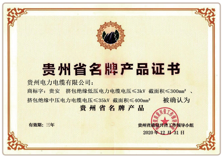 貴州省名牌產(chǎn)品證書